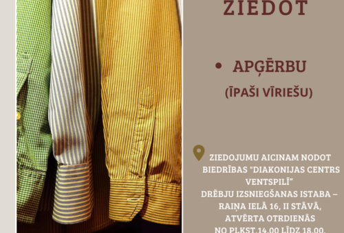 Aicinam ziedot apģērbu (īpaši vīriešu), kas pašiem nav nepieciešams, bet ir labā stāvoklī, tīrs un izmantojams. Ziedojumu aicinam nodot biedrības “Diakonijas centrs Ventspilī Drēbju izsniegšanas…